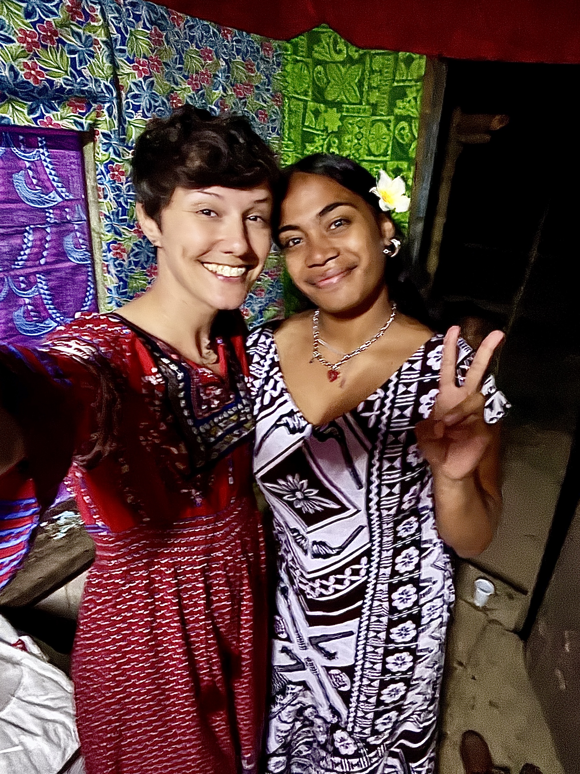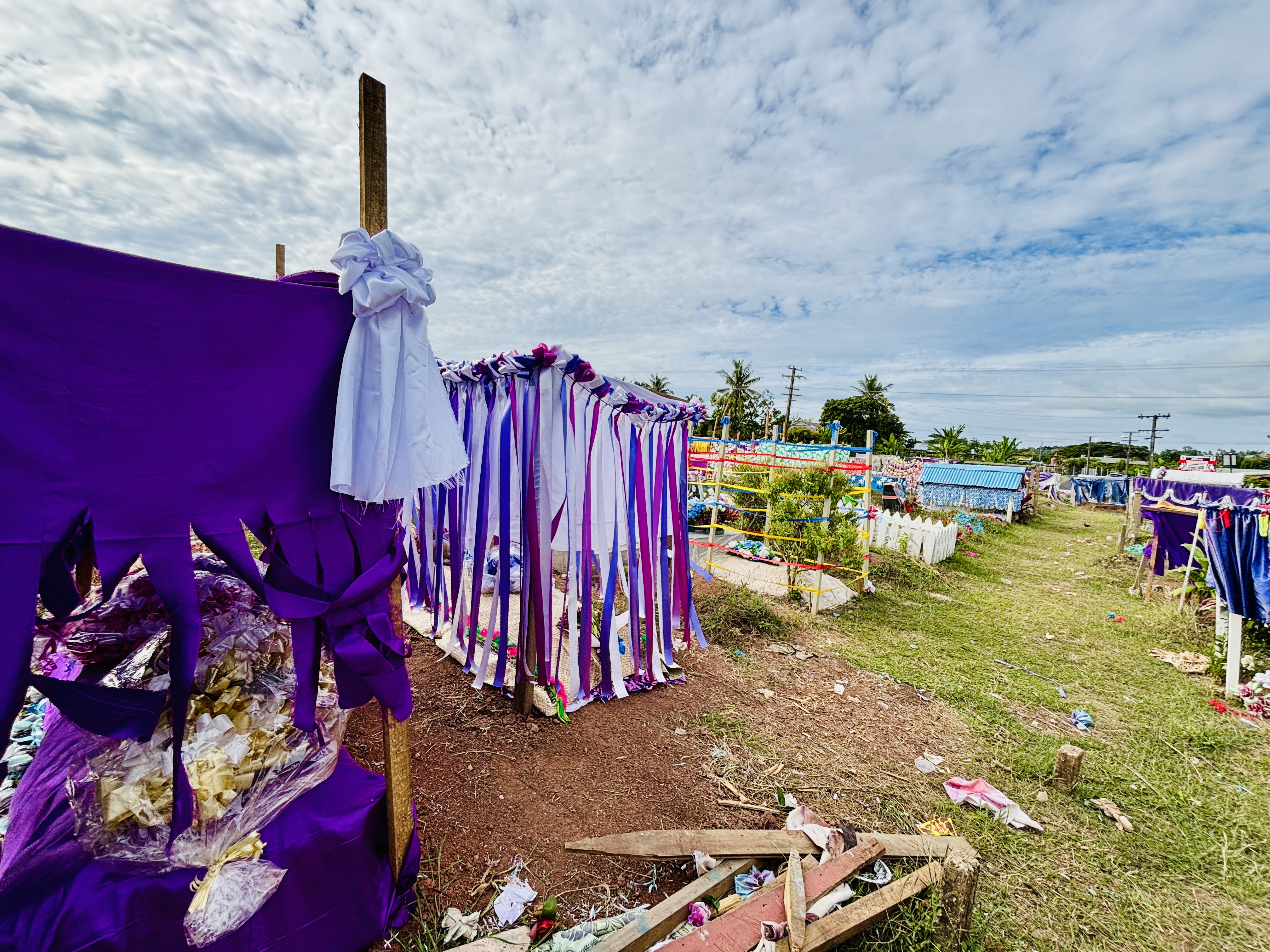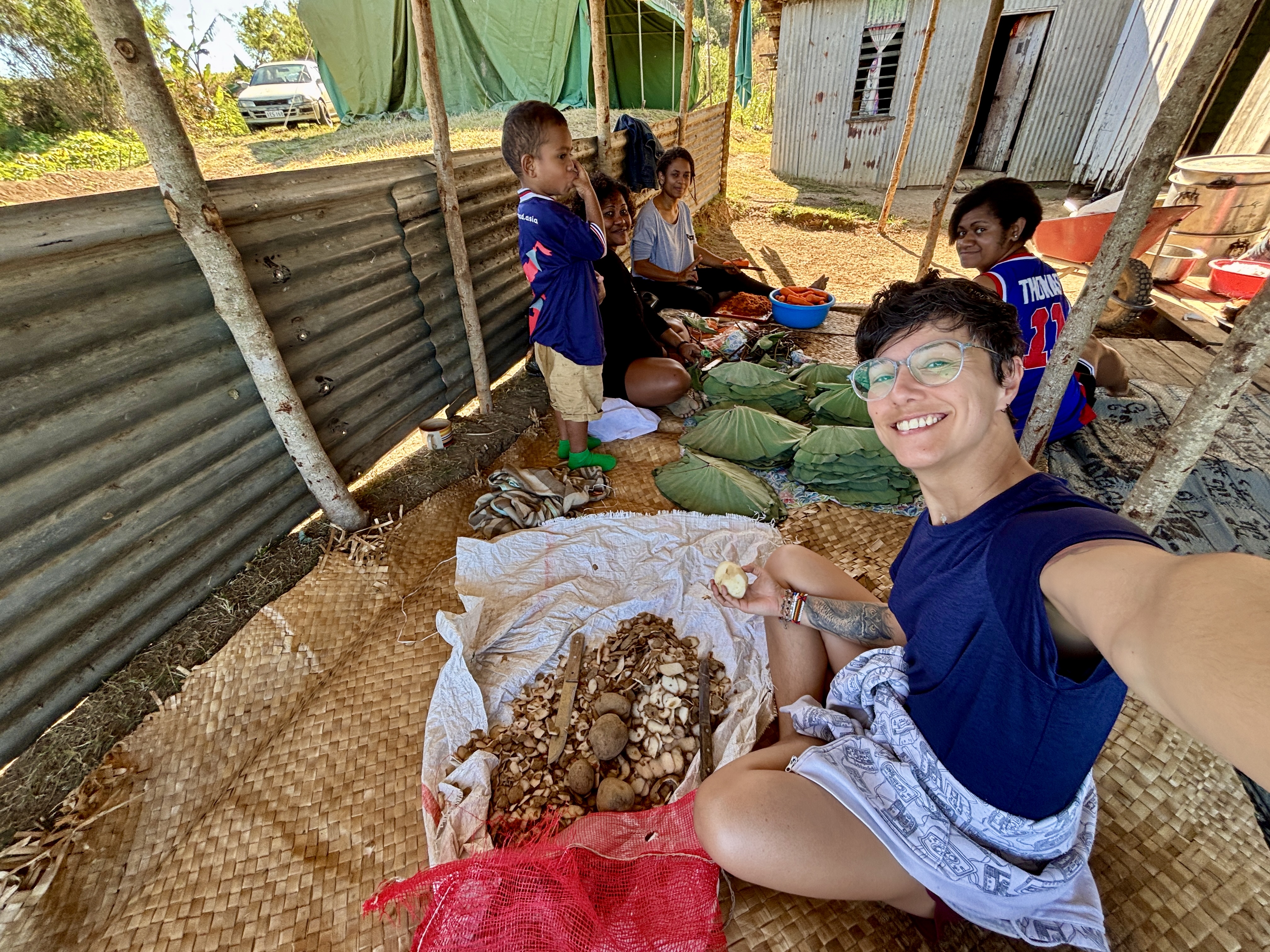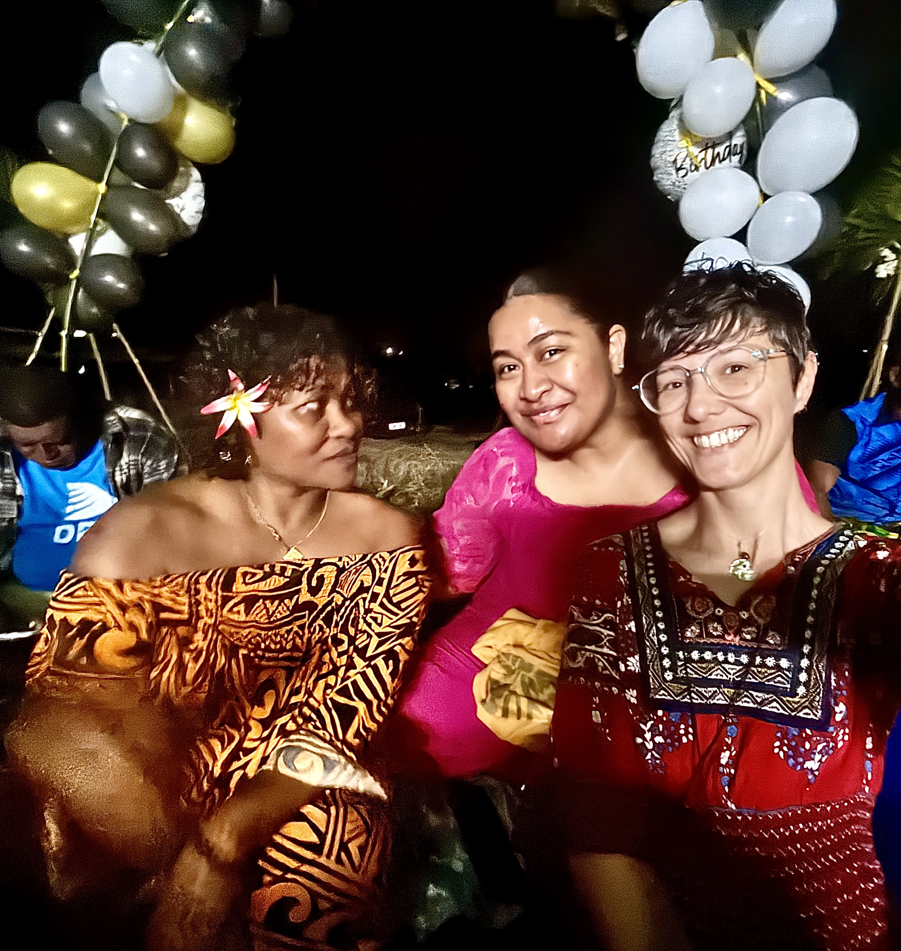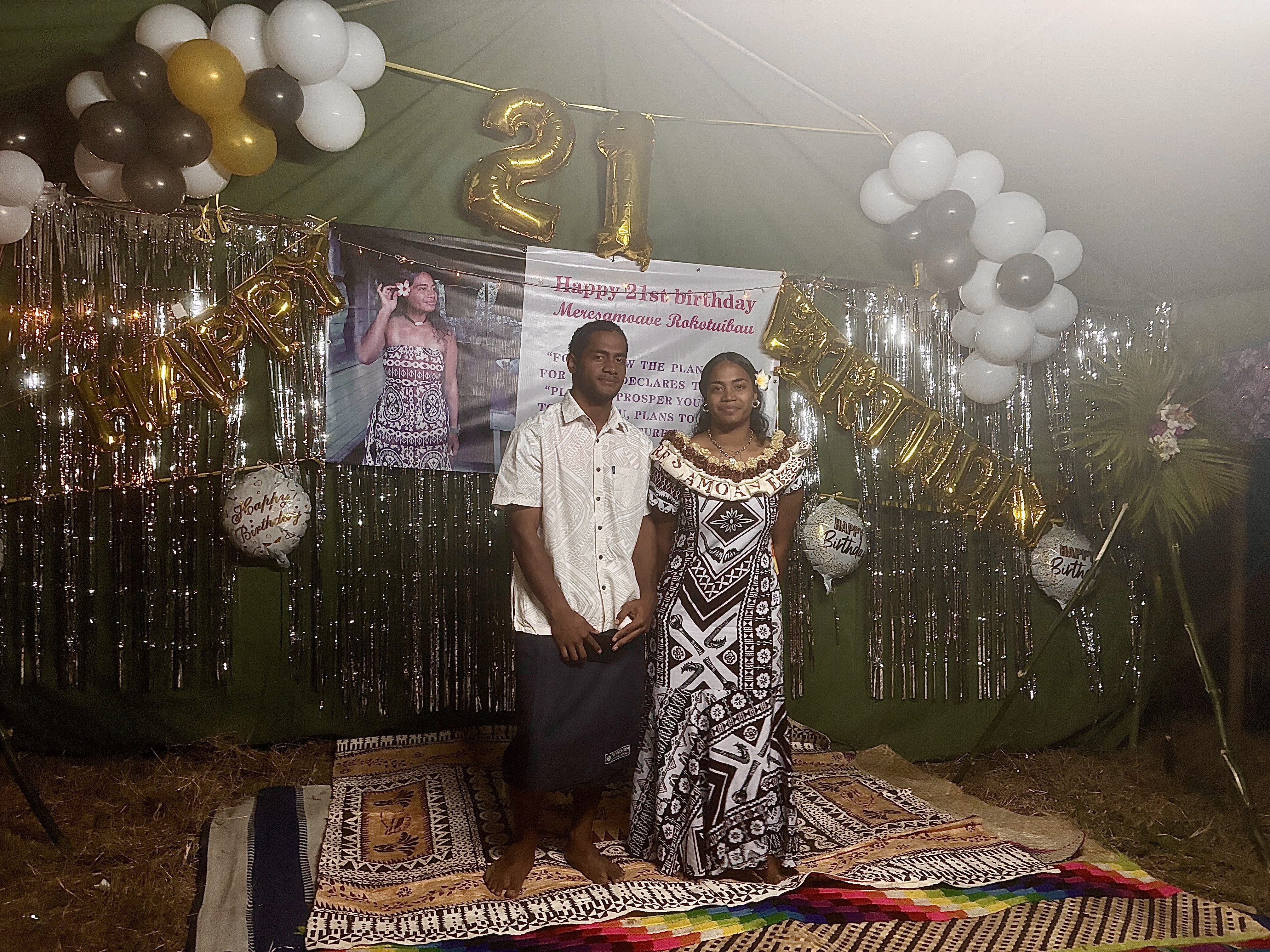 I will be helping Kristine with the decoration. Cool, right? But in the actual day it kind of turns hectic. We should’ve started early morning but ended up only starting in the afternoon, so everything was too late. But we also were helping with all the cooking in the morning. Some family member of Ako came over from Suva to help as well. Kristine and I got a certain amount of balloons and decoration, but out of the blue loads of other balloons and stuff showed up, so there was too much stuff to do. Plus, there are certain traditional decoration we must do in this occasion, all of them made with natural palm leaves and flowers, which Christine and I went hunting in the morning, because they need to be fresh. So yeah, the guests were already all arriving and we hadn’t finished the decoration yet, which was a shame. Because of that we couldn’t really get ready in time to take nice photos altogether in front of the decoration and stuff like that, which made me a bit sad. What to do? The nice thing is that in the last moments other family members were also helping. And the food got ready just by the same time as well. In the end, things looked nice and the food was fabulous and plenty. Everything was plenty. The amount of balloons we had leftover was insane, but at least the kids had their fun.