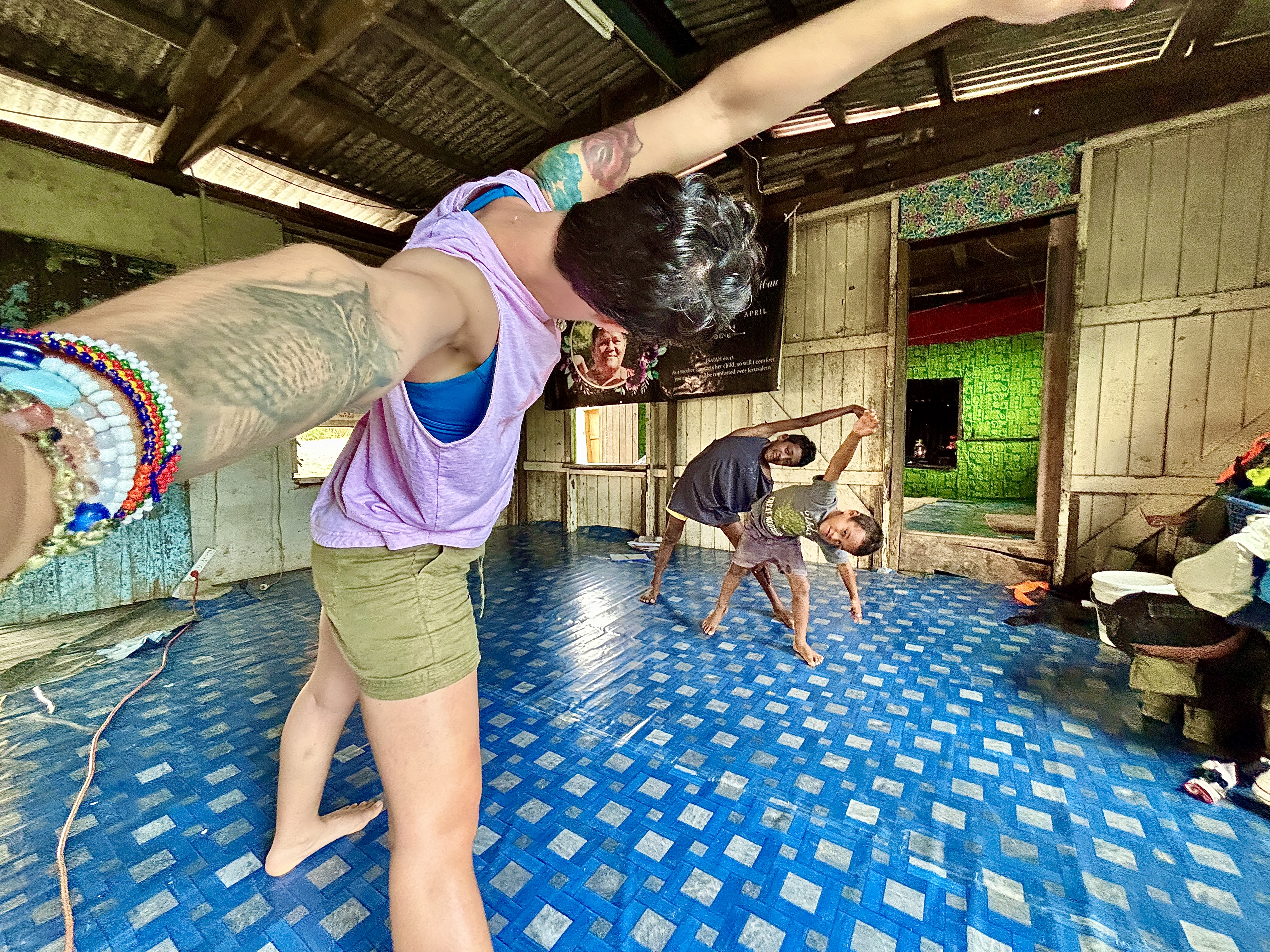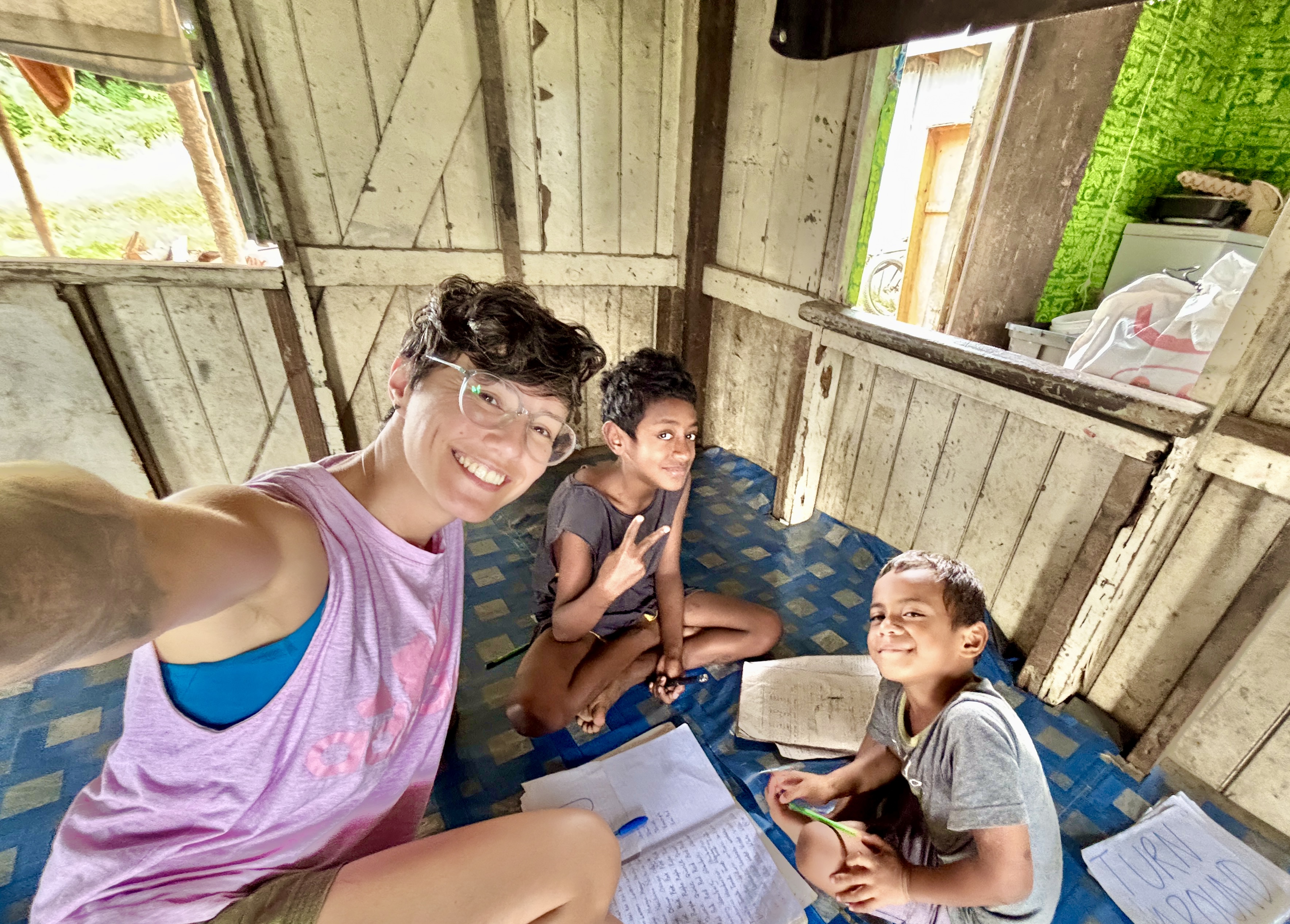 Kristine and Jonathan live here with other family members. Jonathan’s father, Bakata, is not the eldest (his brother living here too, Caci, is the eldest) but people see him in a very high rank. Then there’s three of Jonathan’s brothers also living here, Mika, Dom and George, chronologically speaking. Mika is married to Ako, and they have Rosia (21) and Junia (17). Dom has one boy of 10, also called Dom. And the other little person living here is Sunny, of only 6 years old, the son of another of Bakata’s son, who is in prison. They are all nice to me, Mika is always super positive and says nice things in the morning; Dom always help me with something and even lend me a hoodie from his son; and George cooks some nice dishes for us. But there’s some traces of George personality that piss me off. I help the young boys Sunny and Dom Jr with English and some Maths. We also plays games and have some time for streches.