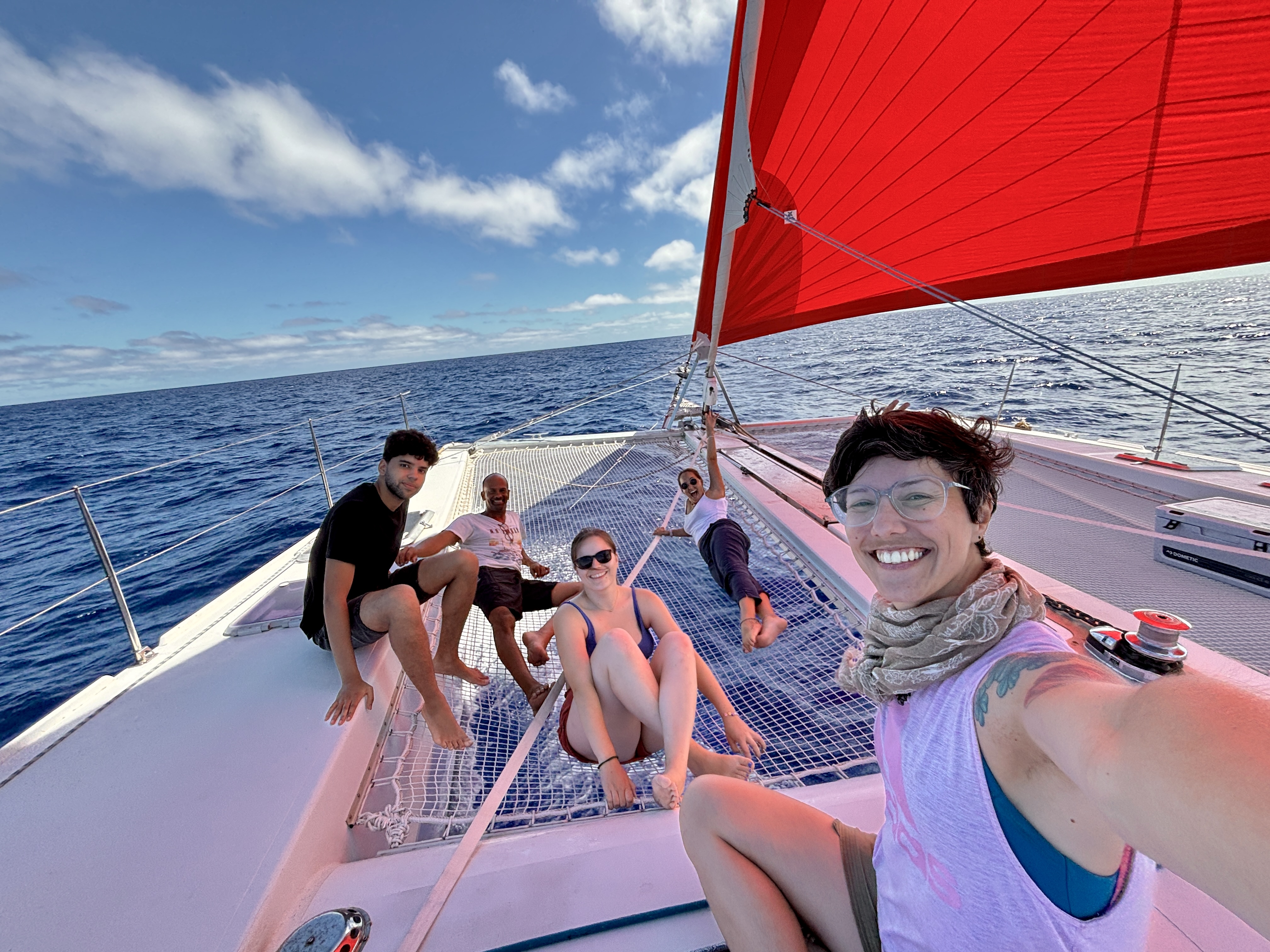 Then we catch a fish! I’m down in my cabin, just trying to take a nap, when it happens. At first, Sergio is the one trying to pull the fish out, with the help of Clara and Irene. After some time, Thomas takes over. There’s a commotion in the boat because we need to speed Ananda down, but as the wind is quite strong, the four of us crew struggle with that. When we finally manage to, Thomas already comes to us and tell us he got the fish out already. What? We all missed that moment and the chance to make a video. What happened is that the fish died half way through, which made things easier. It’s a sailfish and it’s longer than one metre, weighting about 20 kg. Yes, it’s massive! They all hurry up to clean it but I cannot help because I have no idea how to do that.