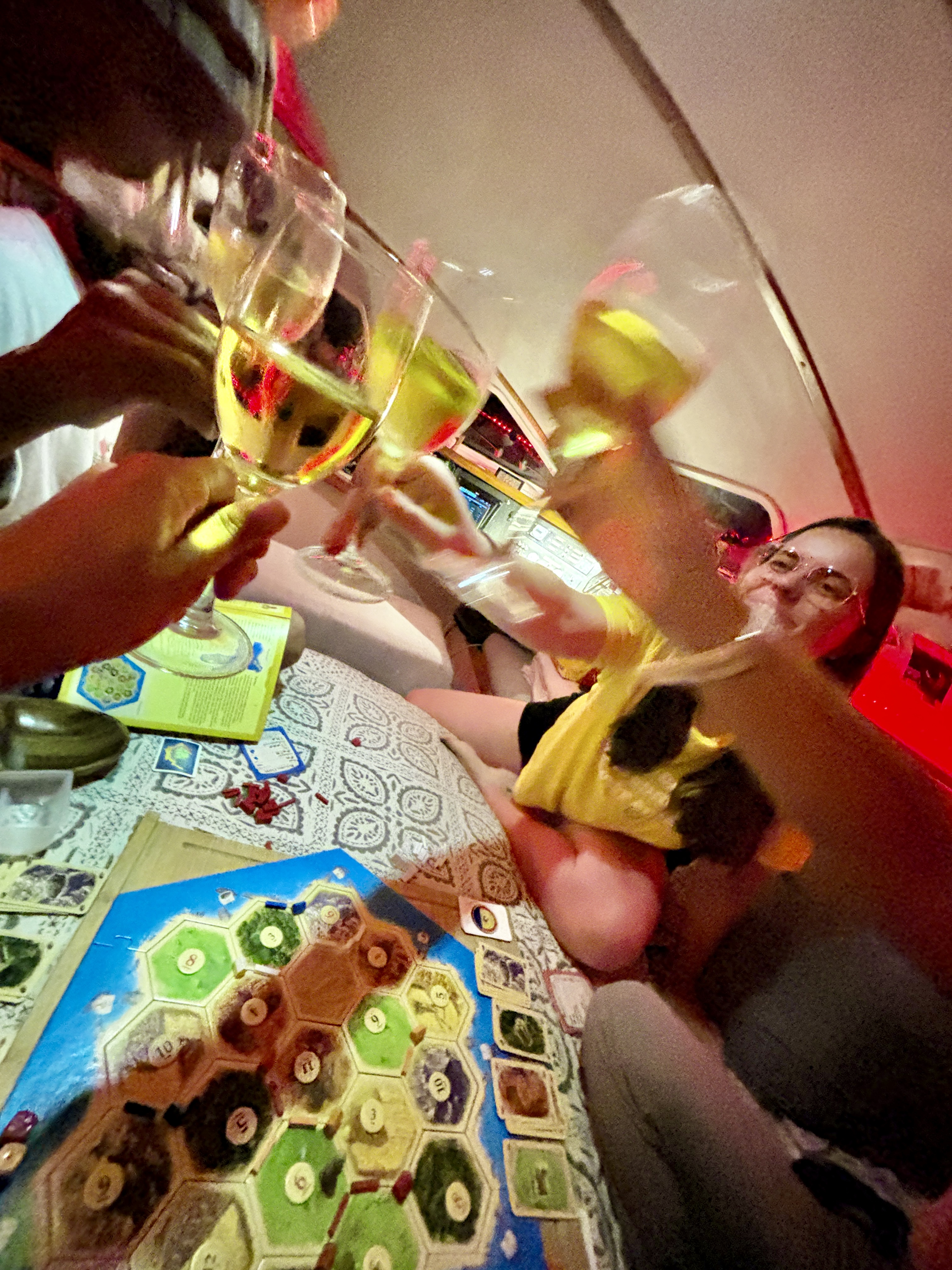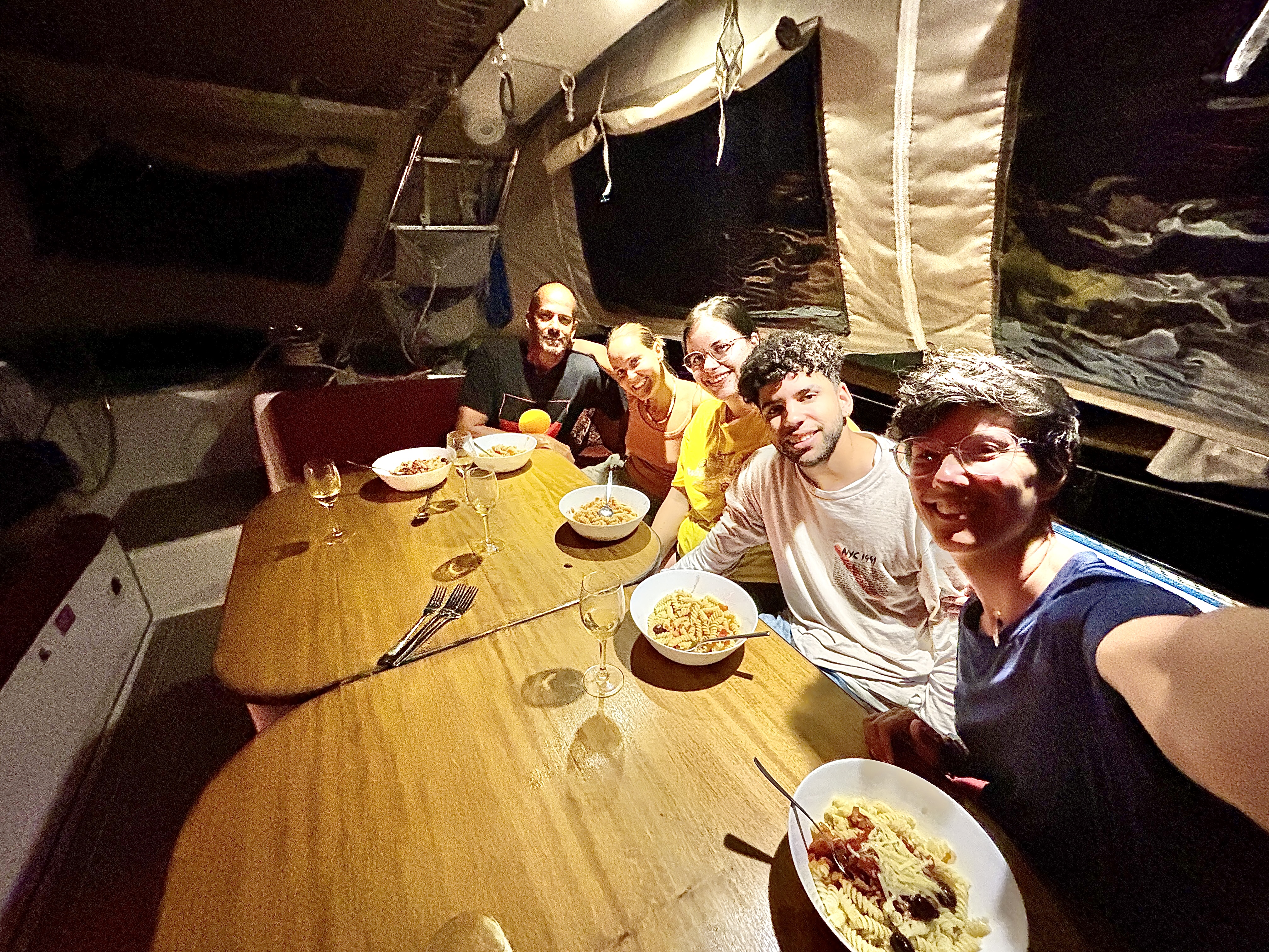 Our last night together onboard of Ananda it’s the best! We are all in a very good mood. We play Katan (my first time playing), and while we are doing that, Thomas surprises us with a glass of wine, snacks, and middle time he prepares pasta for dinner. We laugh a lot and have lots of fun. Plus, the pasta is great! We also have some Rum from Fiji, white chocolate flavor.