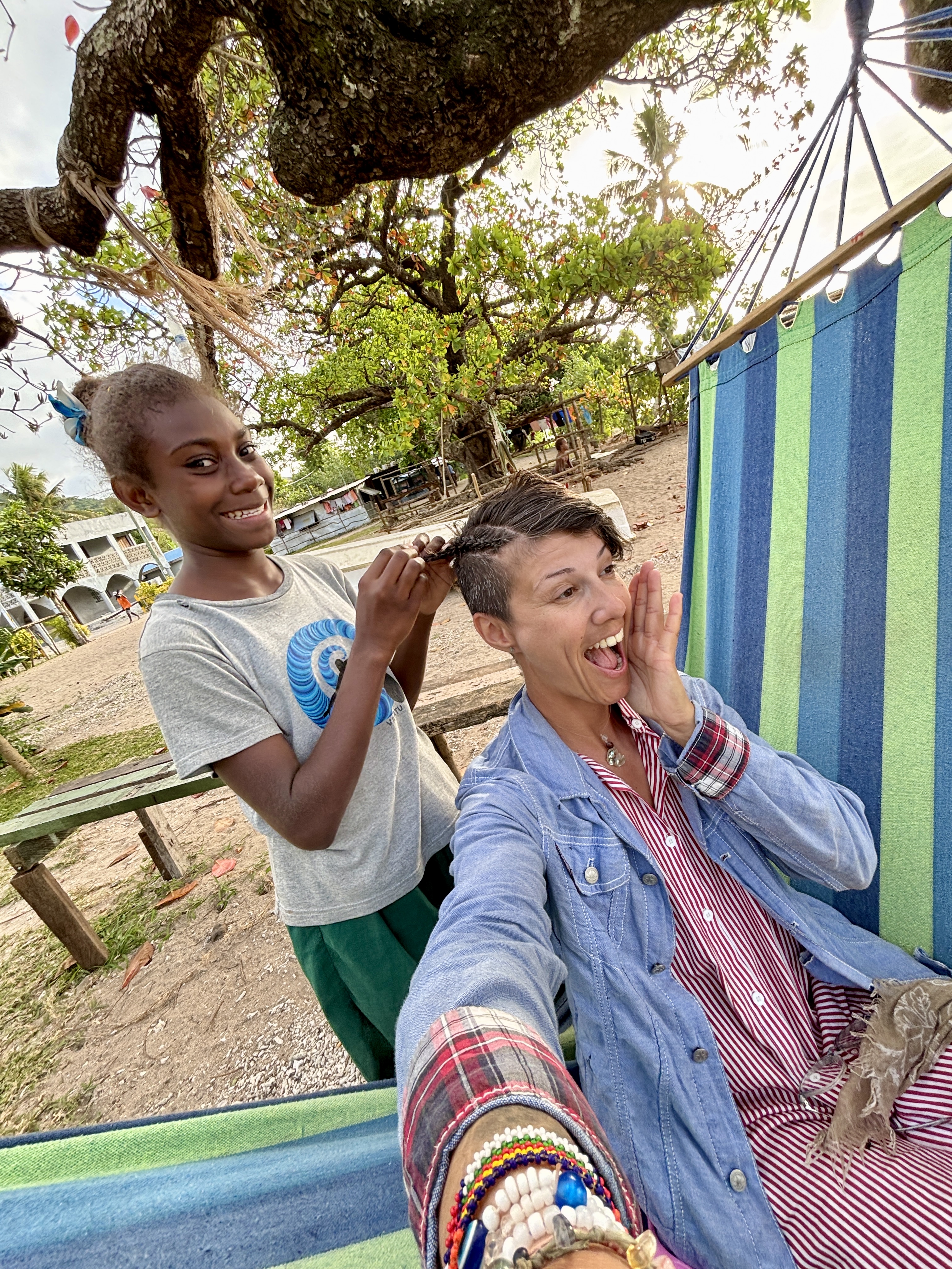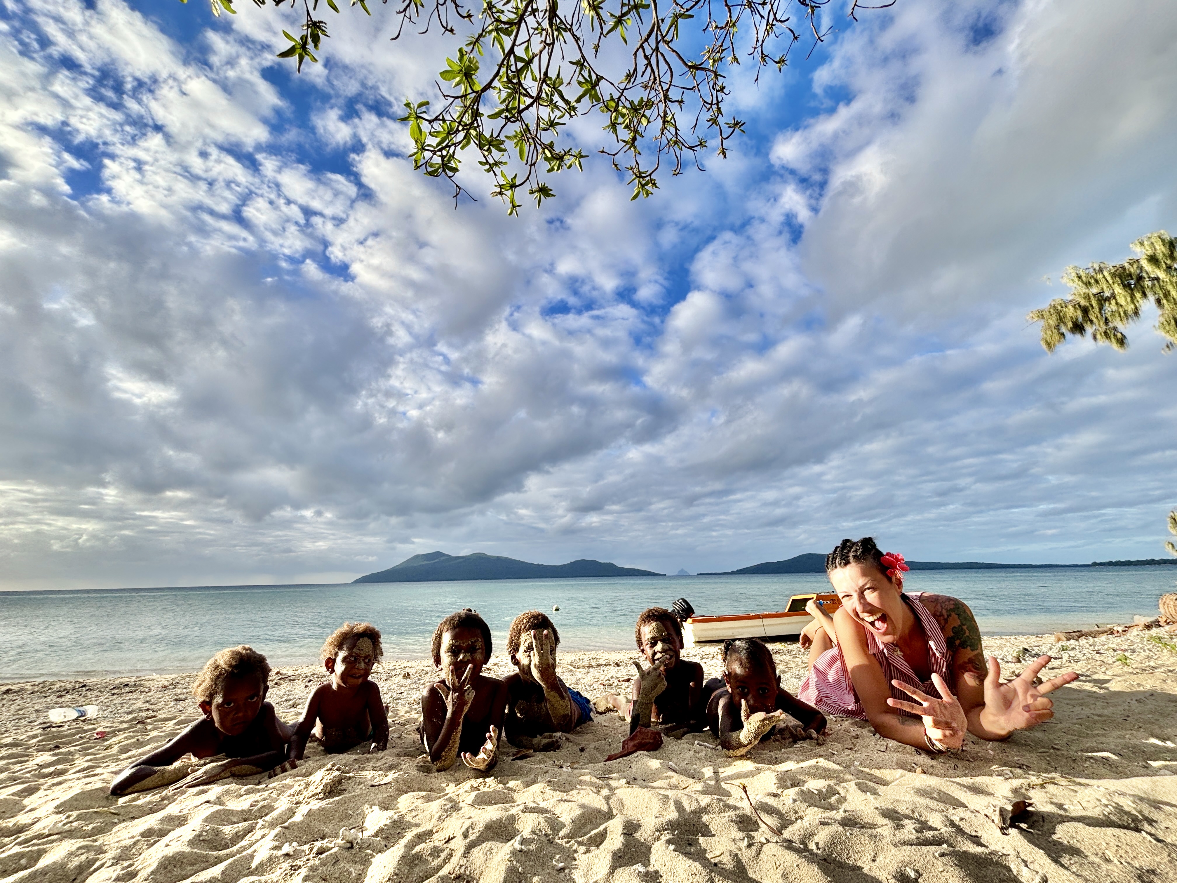 Back in Emua, Selena braids my her. It’s so much fun and it looks absolutely amazing! I love it! Damn I wish I could keep such a nice hair style like that for longer than only a few hours, but if I do, my migraine will start annoying me. We take some really cool photos with the kids, while they are coating themselves in sand, after swimming. They look like major KFC pieces. Laugh.