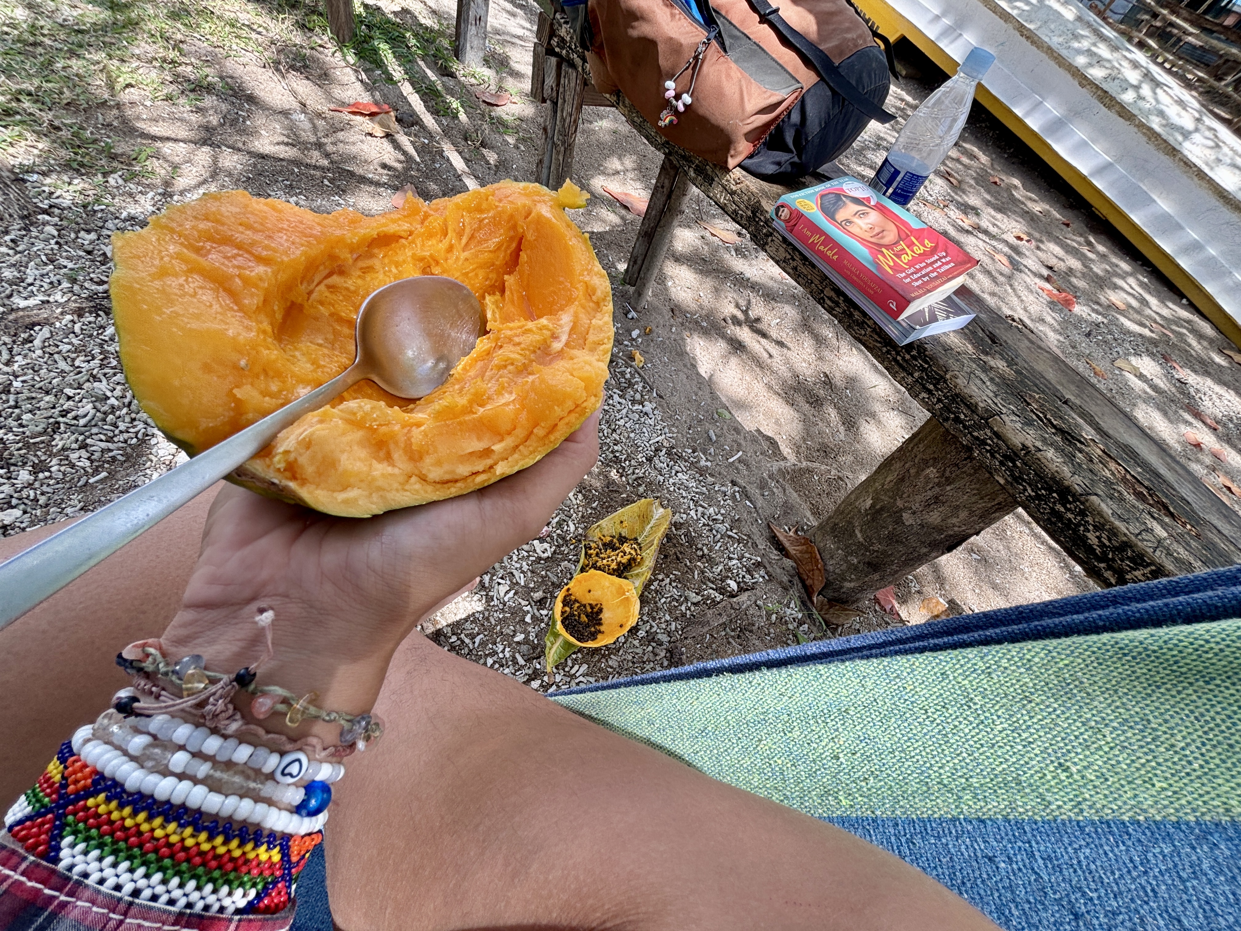 I finally find the courage to pick up a papaya from one of the hundreds of trees alongside the road. There are always some papayas getting rotten, and apart from feeling really bad about that, I love papaya! Here they are called popo, which is very funny for me because in Brazil popo it’s a slang for buts.