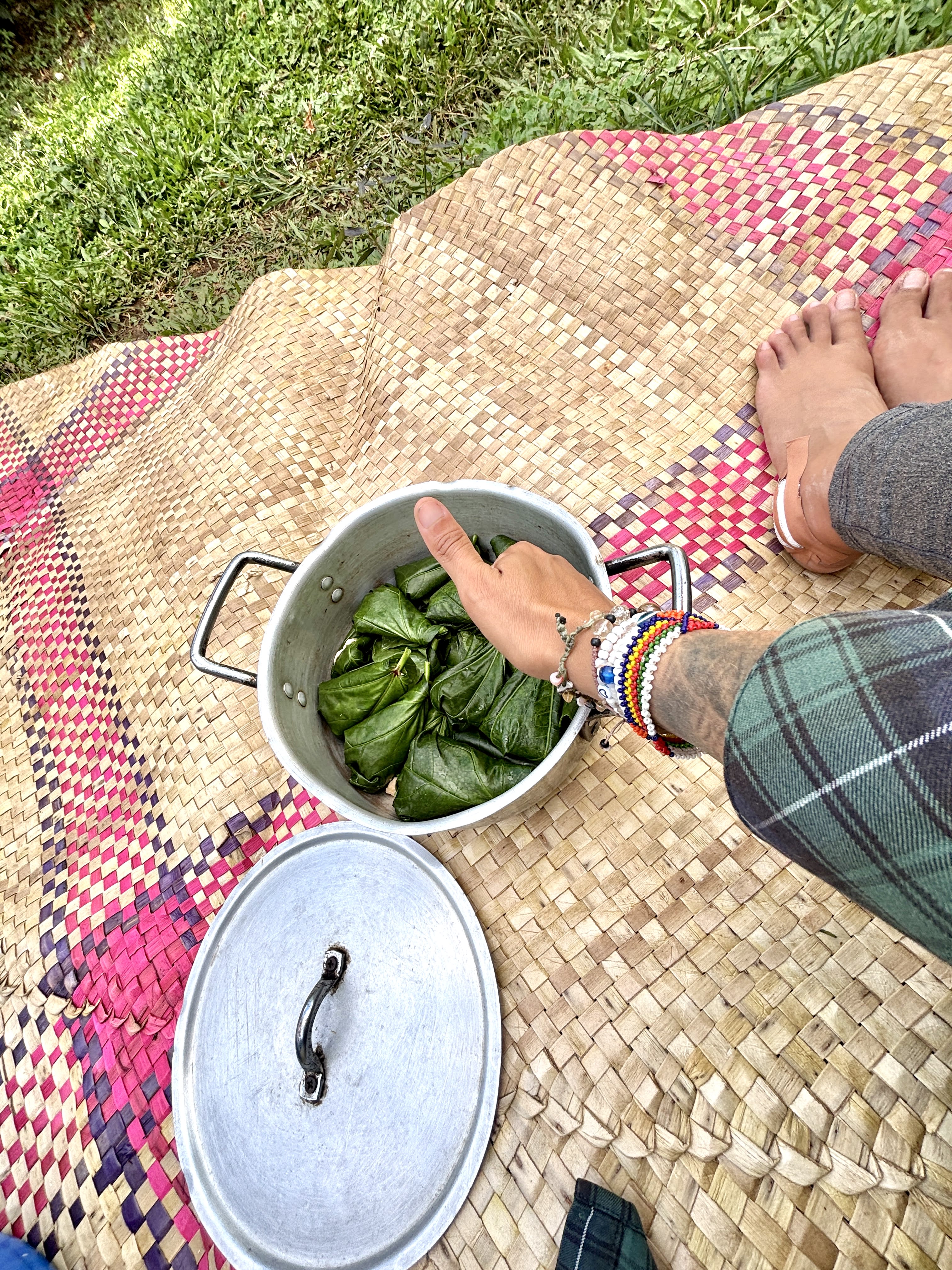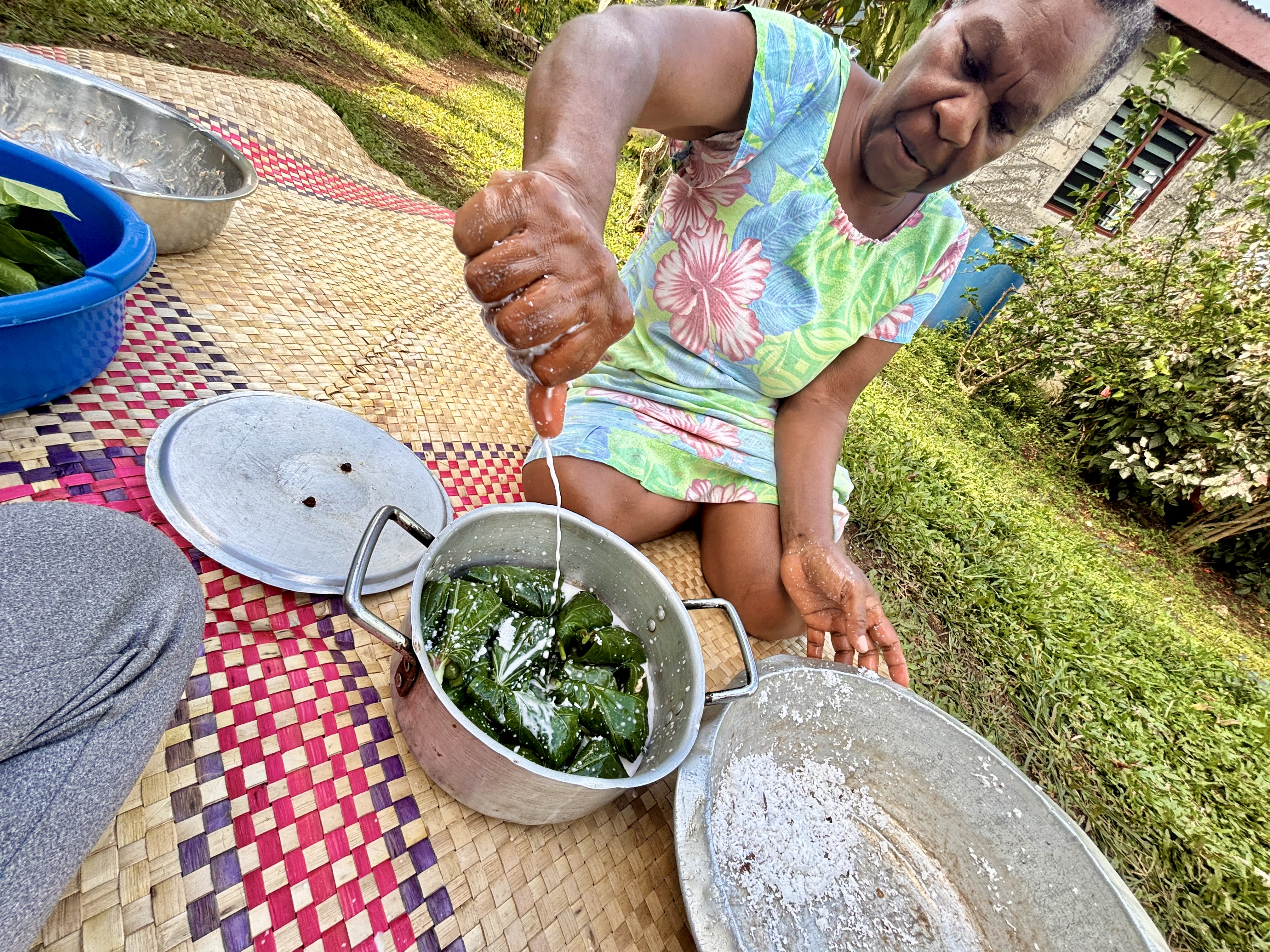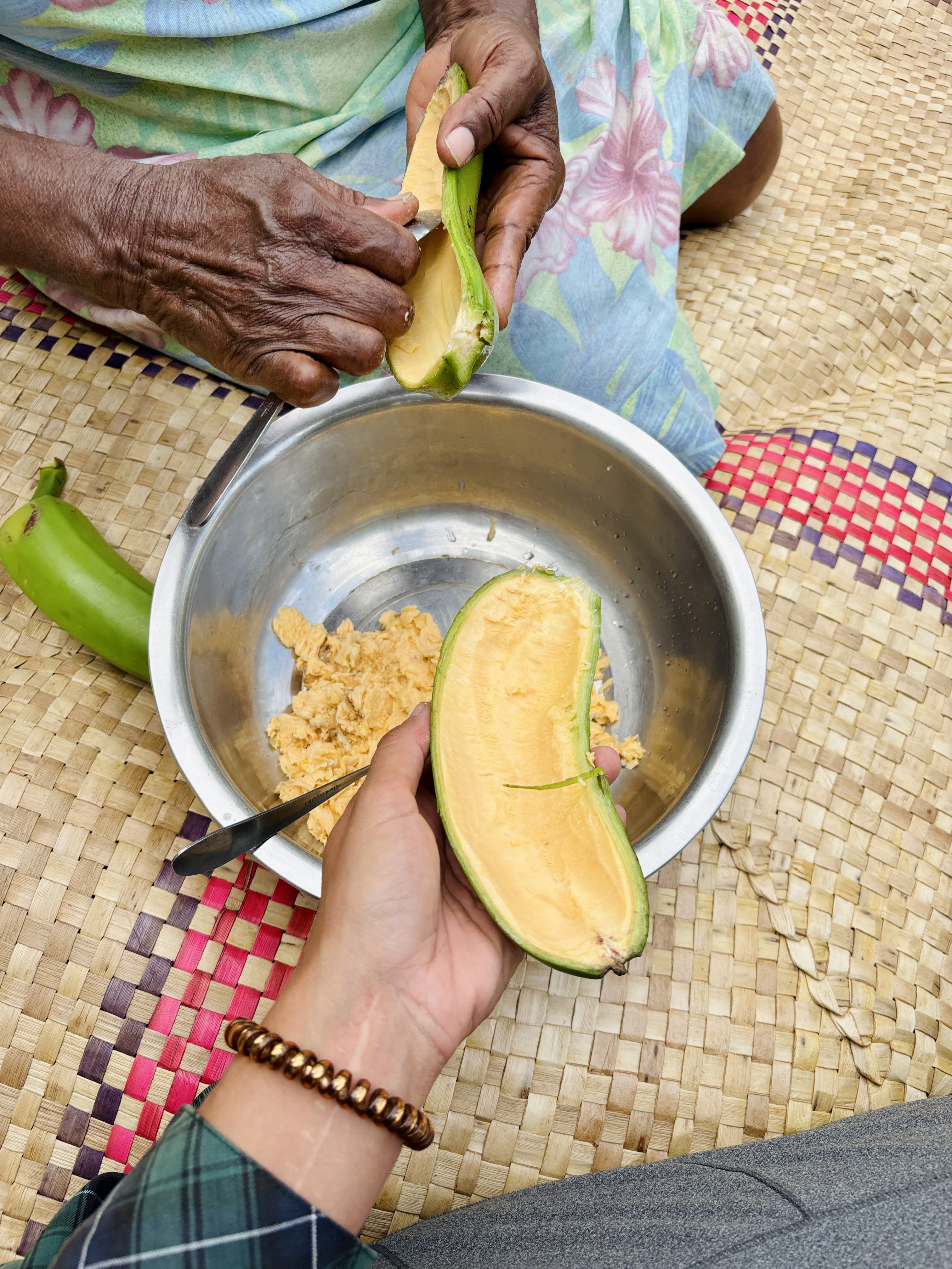 Mum and I make Simboro. We use the orange banana and rip out of the skin using spoons. Easier than grating like I did in Siviri. Mum then prepares a sauce with onions, tomatoes and ginger. It’s very tasty!